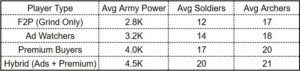 The distribution analysis confirmed a healthy, skill-based meta: the top 2% of F2P players achieved power scores exceeding 4.0K, outperforming 19% of the ‘Premium Buyers’. This means that optimal grinding and resource management by a dedicated F2P user can successfully compete with the lighter spending of less efficient premium users.